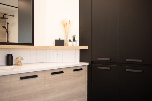 Découvrez ce projet de rénovation de salle de bain qui allie fonctionnalité, esthétisme et audace. L'optimisation de l'espace a été une priorité avec la conception d'une grande vanité sur mesure, intégrant du rangement astucieux pour les appareils de coiffure, le panier à linge et la poubelle, afin de répondre aux besoins du quotidien tout en restant discrètement dissimulés. Une vaste lingerie sur mesure a également été intégrée, offrant un maximum de rangement.